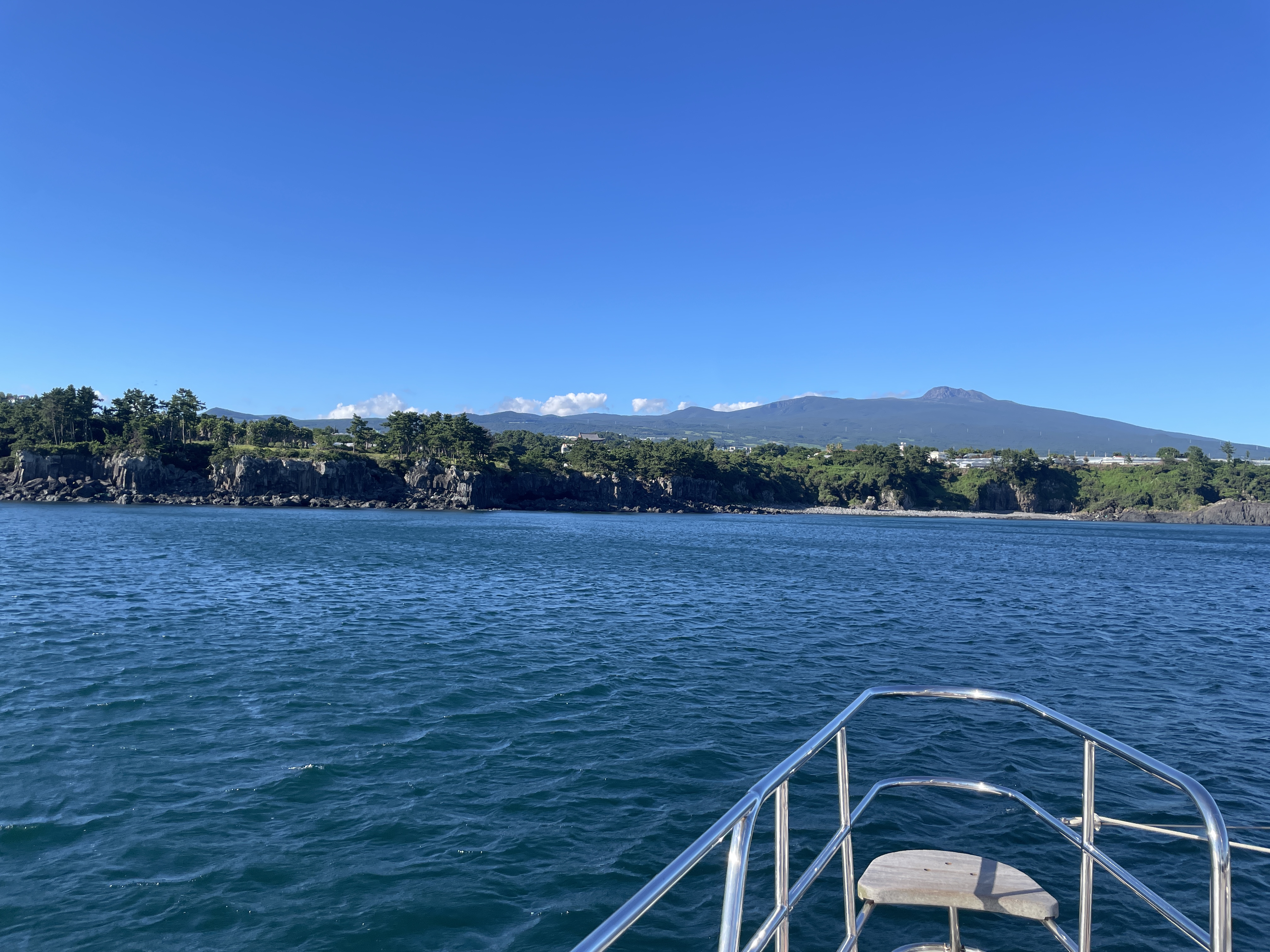 여행 내내 날씨가 좋았는데, 저기 멀리 한라산도 보입니다~ 흐리고 안개, 구름이 많이 끼는 날이 많은 제주라서 요트 관광하면서 한라산이 보이는 경우는 운이 좋은 거라고 합니다.