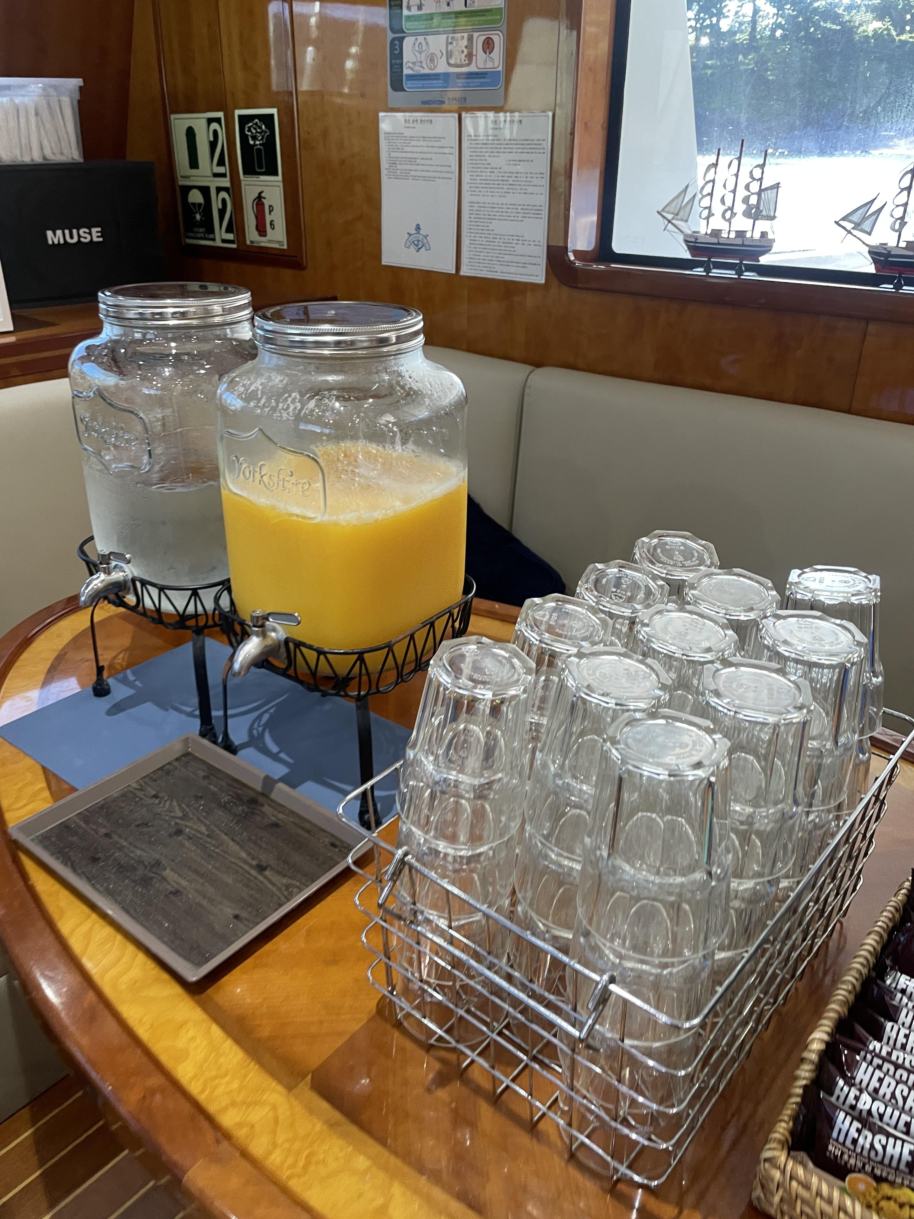 이 외에도 생맥주, 슬러시 등등이 준비되어 있어서 1시간 동안의 요트 관광 입이 즐겁습니다.