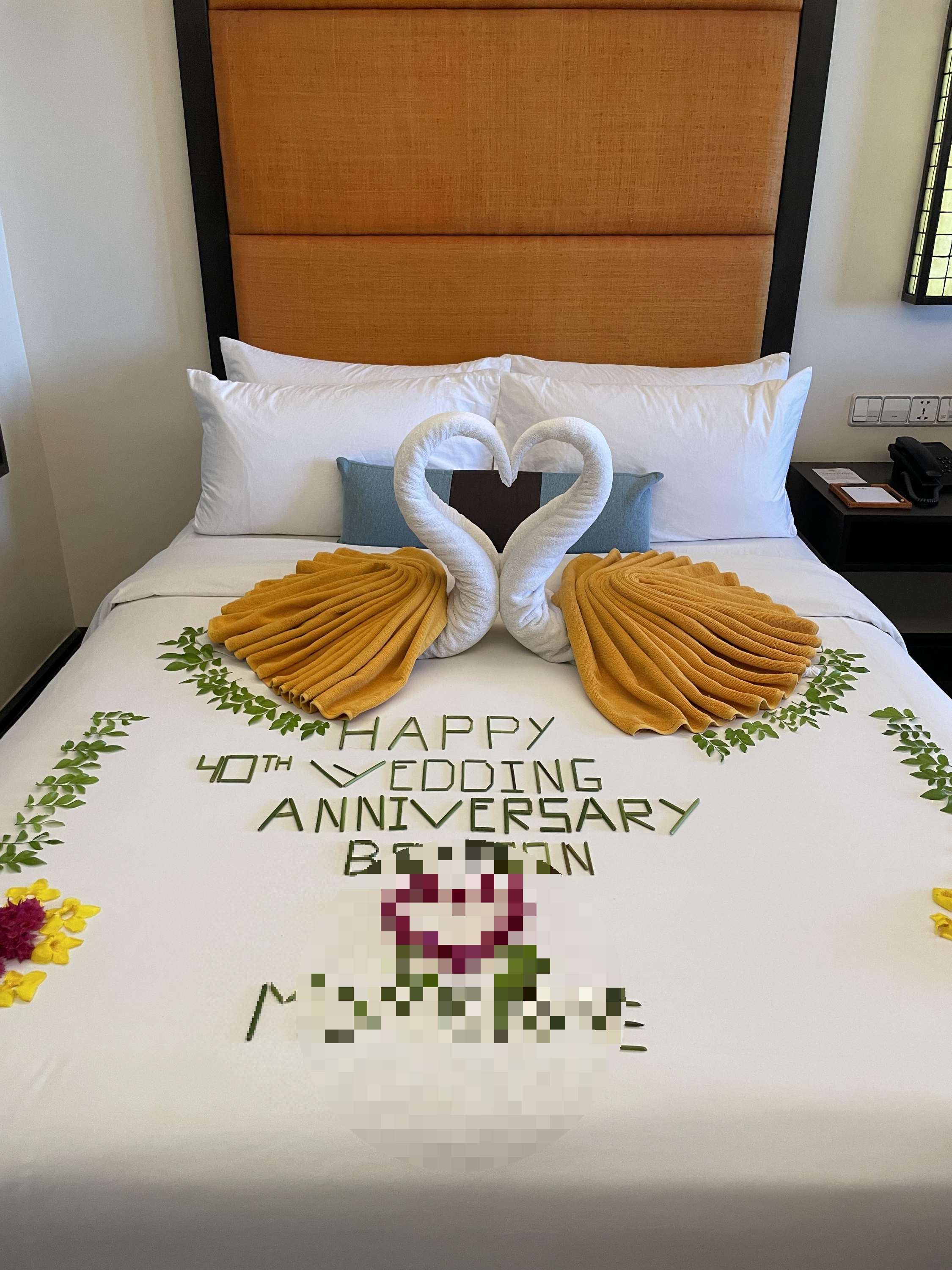 객실 침대에 이렇게 예쁘게 축하메세지를 준비해주셨네요~