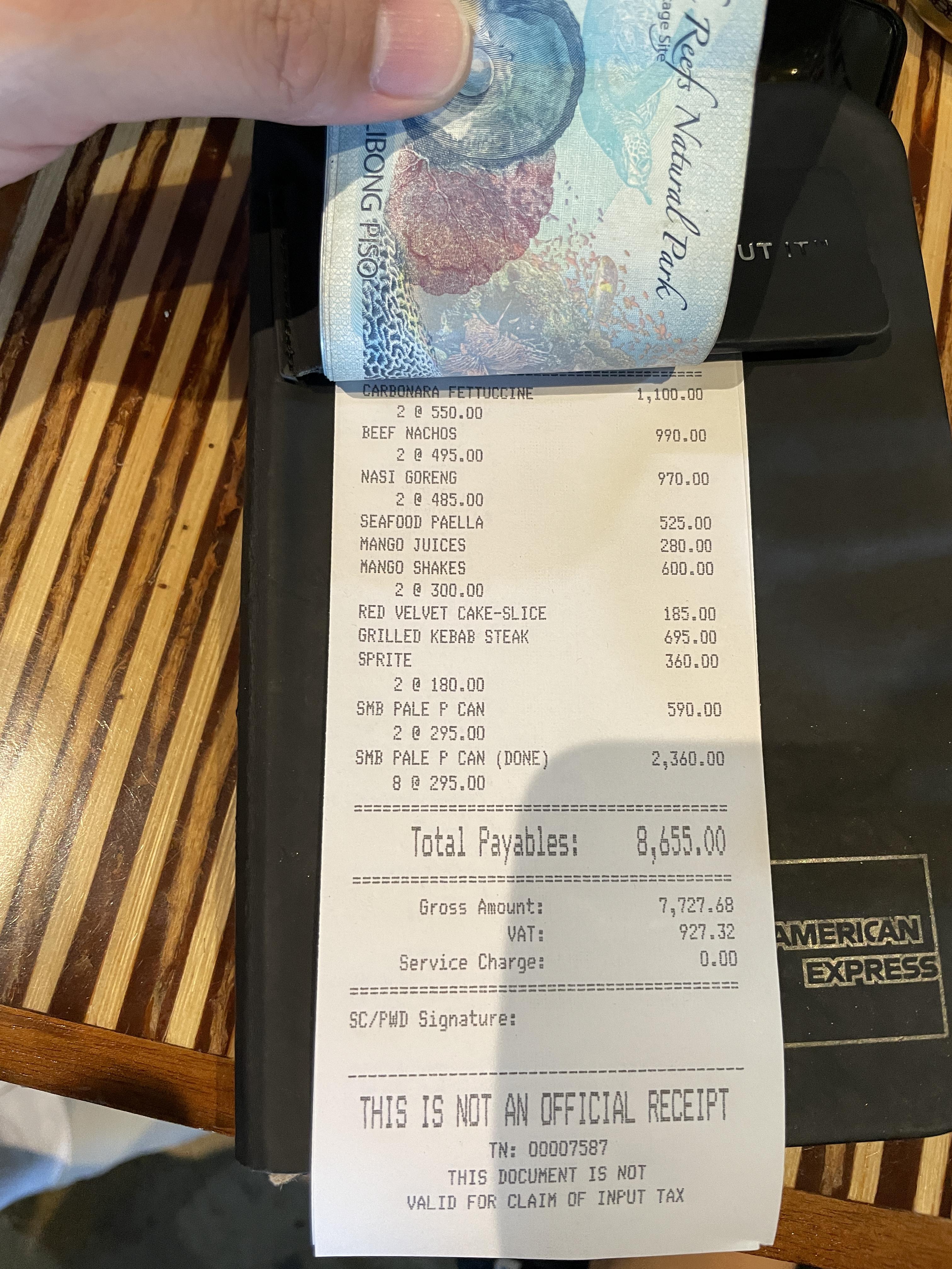 12명 점심식사 비용은 8,655페소, 한화 약 21만원이 나왔네요~ 리조트 내 식당이라 역시나 비싸군요~