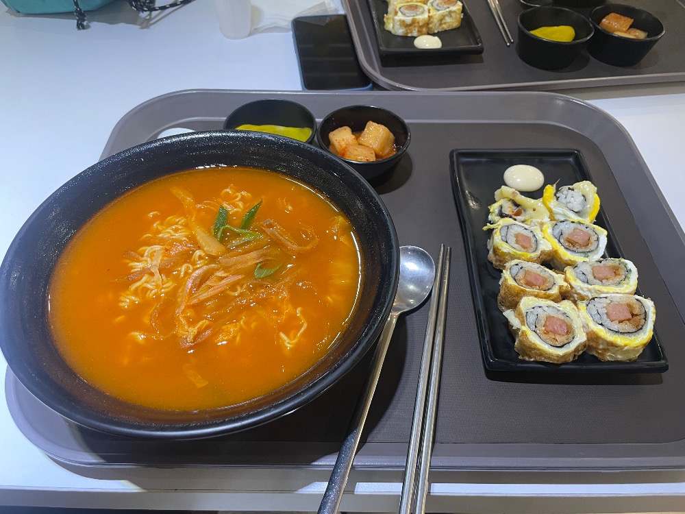 라면이랑 스팸계란말이 김밥으로 든든히 채워줍니다.